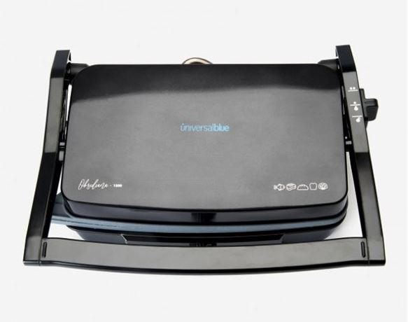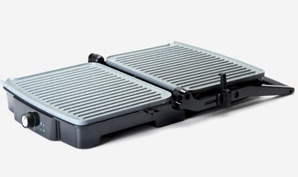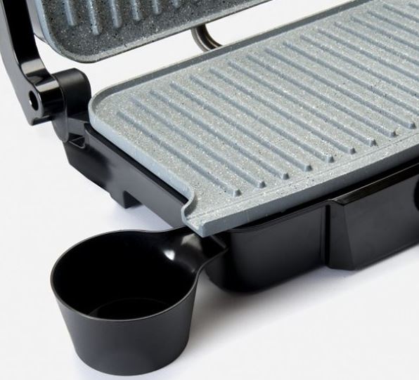 Grill de 1500W de potencia – Fácil de cocinar y fácil de limpiar gracias a sus placas con revestimiento RockStone antiadherente – Tirador con tacto frío: Mango resistente al calor para evitar quemaduras – Apertura 180º: puede abrirse 180º para que puedas cocinar una mayor cantidad de alimentos – Bandeja recogegrasa: Platos más saludables y con menos aceite gracias a su bandeja recogegrasas – Elegante diseño en color negro y detalles en color azul.