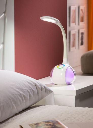 Lámpara sobremesa LED realizada en material acrílico blanco – Pulsador con regulador táctil – Brazo flexible con difusor de protección ocular y base con globo de luz multicolor RGB – Potencia de 5W.